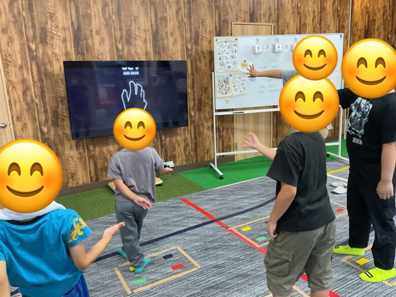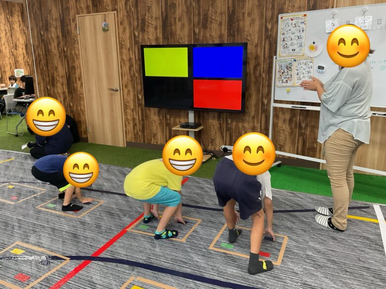 ビジョントレーニングで画面と同じ色のテープを踏むステップゲームをしました!3色以上になると手も使って動いていました🖐️