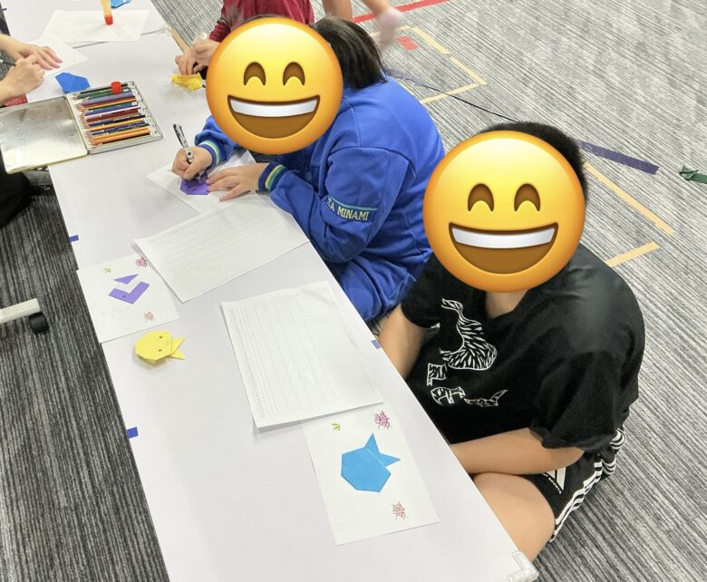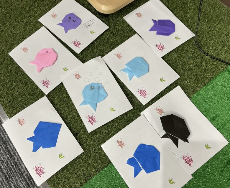 折り紙でクラゲを折って顔を描き、紙に貼って水族館を作りました!!