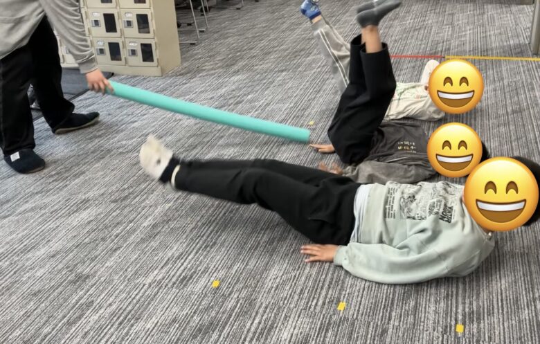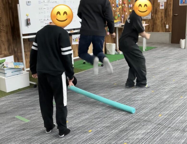 プールスティックを使ってジャンプしたり、棒に当たらないように避けたりしました!